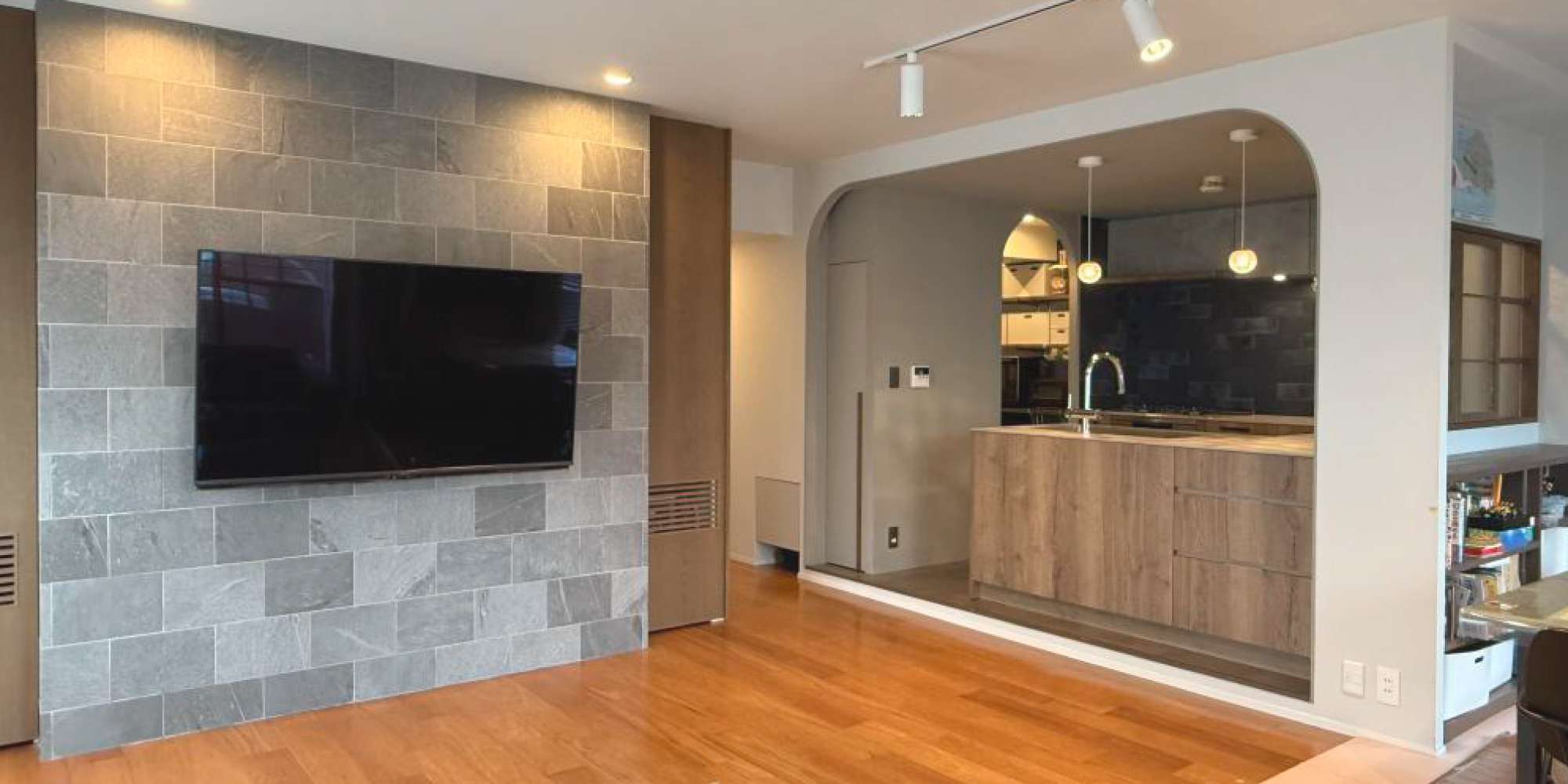 壁掛けテレビの背面には収まりにこだわったタイル貼と収納家具、変形タイルの洗面台に板貼の扉、木製の引戸取っ手や金属製のつまみ等、一つ一つ遊び心をもって選定。どの動作をするときも少しテンションが上がる…、そんなこだわりのあるお住まいです。