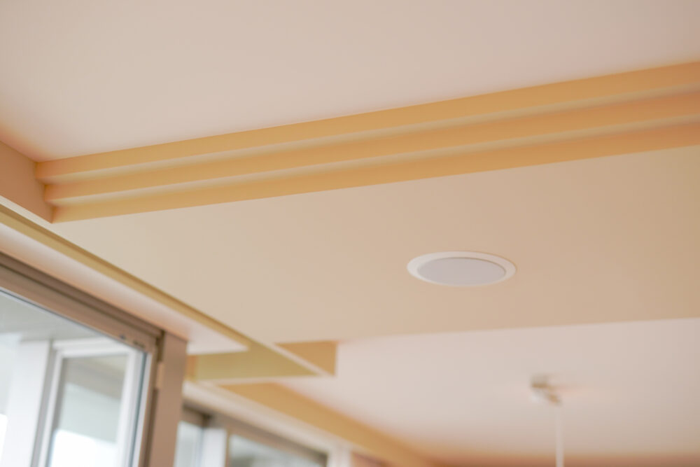 既存の天井埋め込みスピーカーの配置計画する際、やむを得ずできたLDK中央の下がり天井に