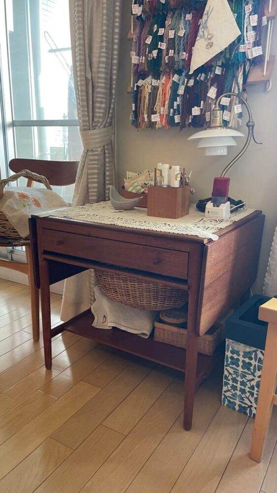 団らんの場にはヴィンテージのハンス・J・ウェグナーのエクステンションテーブルやソーイングデスク、