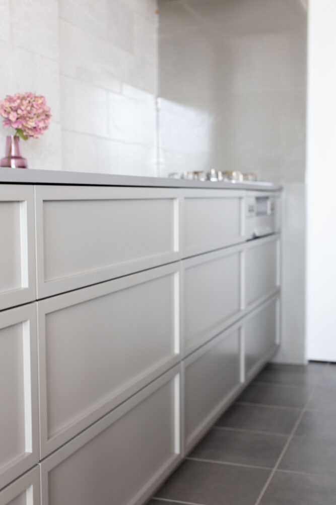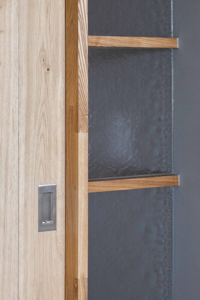 また、収納扉のパネルは框のデザインを採用しましたが、うるさくならないよう框の中に手掛けを隠して彫り込む設計としました。