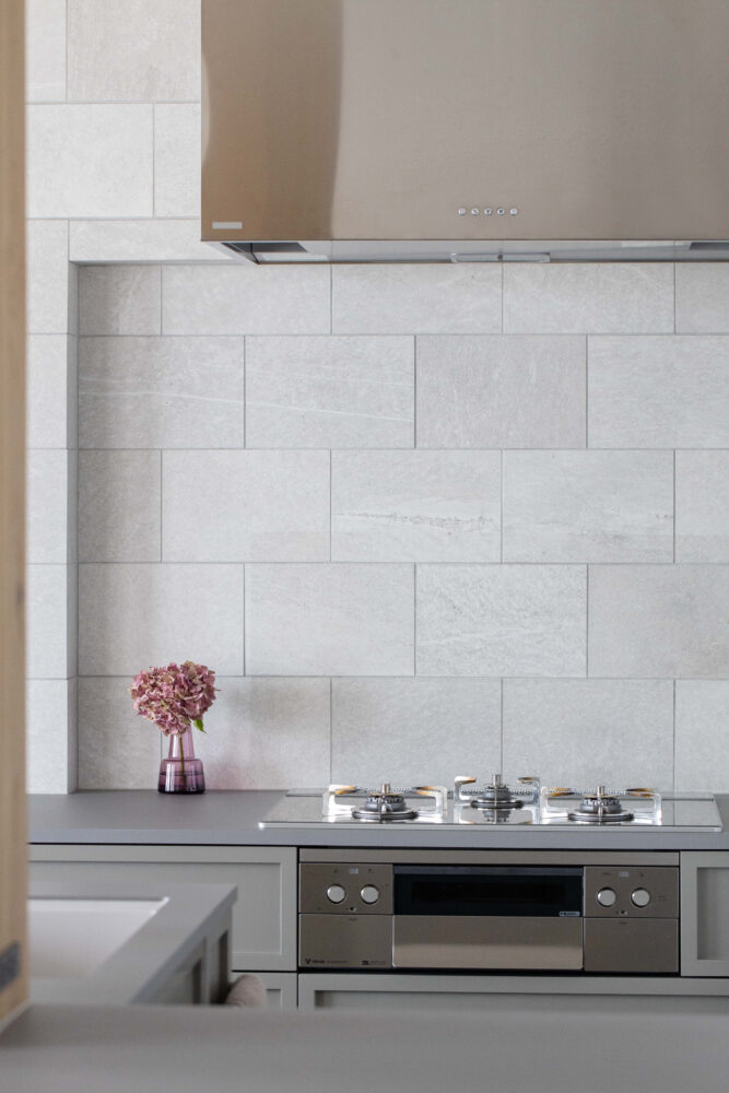 タイル幅に合わせて段差も微調整しています。(高さはレンジフード合わせ)