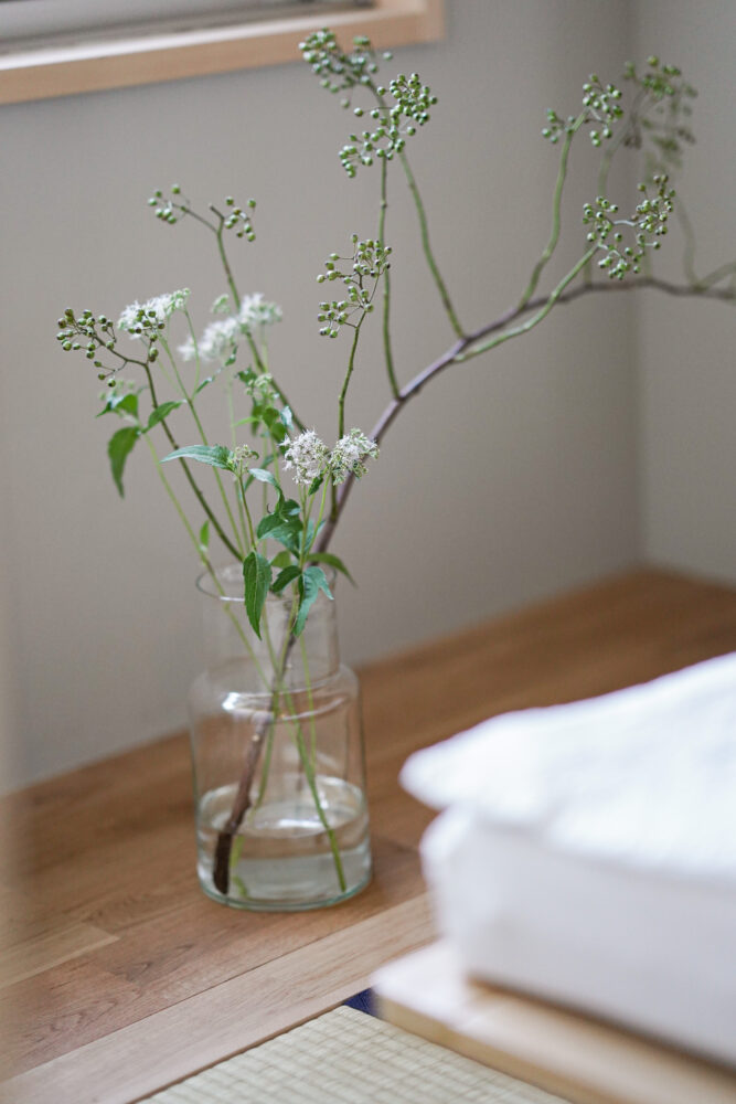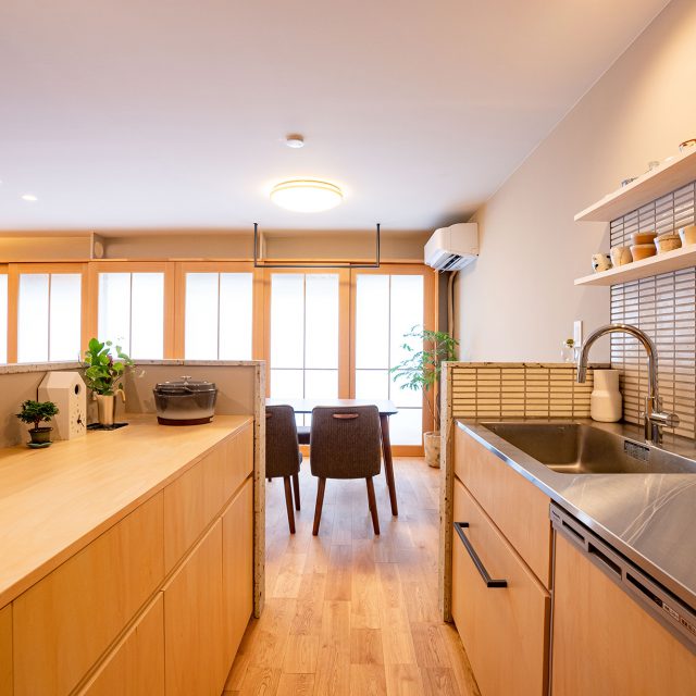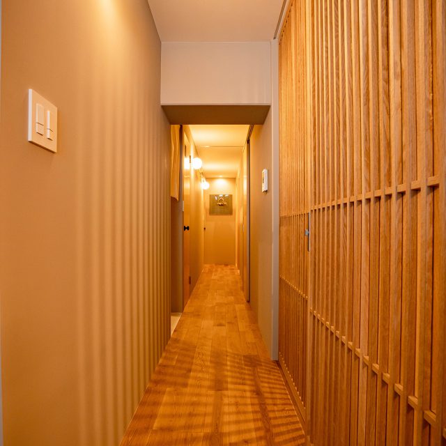 玉砂利敷きの植栽ブースと和建具が、玄関扉を開けた”一歩目”を演出します。
